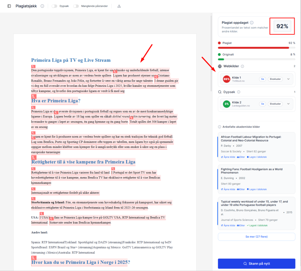 Når du kjører teksten gjennom et verktøy før innlevering, får du ofte en liste over treff mot nettsider og dokumenter. Det betyr ikke automatisk at du har jukset; det betyr at du har et utgangspunkt for å rydde opp, forbedre kildehenvisninger og sikre at det du leverer står i tråd med retningslinjene dine har.